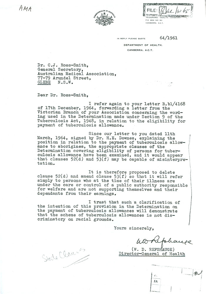 The Director-General of Health supports the proposal to remove the racially discriminatory clauses in the determination on the Tuberculosis Allowance made under the Tuberculosis Act 1948.
